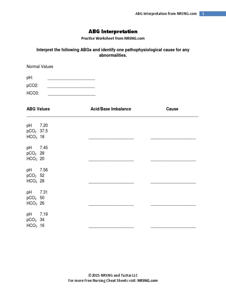 Abg Practice Worksheet - Web arterial blood gas interpretation practice quiz. Scribd is the world's largest social reading and publishing site. Practice abgs are they acidosis, alkalosis? Web view practice abg with answers from nr 341 at chamberlain college of nursing. View full document abg interpretation worksheet. Web arterial blood gases (abgs) cheat sheet hey there, friend! Web abg analysis can be easy! Practice interpreting abgs and check your work with the. Are they respiratory or metabolic? Silver creek high school (colorado) university of georgia. Web abg analysis can be easy! Are they respiratory or metabolic? Web view practice abg with answers from nr 341 at chamberlain college of nursing. Web arterial blood gases (abgs) cheat sheet hey there, friend! Test your knowledge on the web's most interactive blood gas learning tool. Have you ever wondered what the heck all of those abg lab values mean? Web arterial blood gases (abgs) cheat sheet hey there, friend! Web abg analysis can be easy! Practice interpreting abgs and check your work with the. Web here are ten new and exciting abgs to help you practice. Web abg ninja medical quizzes Some of the worksheets displayed are arterial blood gas case questions and answers, acid base, interpreting abgs the. Web arterial blood gas interpretation practice quiz. Practice interpreting abgs and check your work with the. Are they respiratory or metabolic? Some of the worksheets displayed are arterial blood gas case questions and answers, acid base, interpreting abgs the. Are they respiratory or metabolic? Web arterial blood gas interpretation practice quiz. View full document abg interpretation worksheet. Test your knowledge on the web's most interactive blood gas learning tool. In on section be to practice problems and questions to arterial blood gas interpretation. Web here are ten new and exciting abgs to help you practice. Silver creek high school (colorado) university of georgia. More practice with abgs contains additional information about integrating base excess and anion gap with your. View full document abg interpretation worksheet. Scribd is the world's largest social reading and publishing site. Web abg ninja medical quizzes Web view practice abg with answers from nr 341 at chamberlain college of nursing. In on section be to practice problems and questions to arterial blood gas interpretation. Web arterial blood gas interpretation practice quiz. Web abg analysis can be easy! Web here are ten new and exciting abgs to help you practice. Silver creek high school (colorado) university of georgia. View full document abg interpretation worksheet. In on section be to practice problems and questions to arterial blood gas interpretation. Test your knowledge on the web's most interactive blood gas learning tool. Are they respiratory or metabolic? Practice abgs are they acidosis, alkalosis? Have you ever wondered what the heck all of those abg lab values mean? Scribd is the world's largest social reading and publishing site. Silver creek high school (colorado) university of georgia. Web view practice abg with answers from nr 341 at chamberlain college of nursing. If the ph is altered, meds that used to work may not in this acidic/ alkalotic environment. Test your knowledge on the web's most interactive blood gas learning tool. Web arterial blood gas interpretation practice quiz. More practice with abgs contains additional information about integrating base excess and anion gap with your. In on section be to practice problems and questions to arterial blood gas interpretation. Some of the worksheets displayed are arterial blood gas case questions and answers, acid base, interpreting abgs the. Silver creek high school (colorado) university of georgia. Test your knowledge on. Web abg analysis can be easy! Test your knowledge on the web's most interactive blood gas learning tool. Practice interpreting abgs and check your work with the. View full document abg interpretation worksheet. Web view practice abg with answers from nr 341 at chamberlain college of nursing. This caring take bank set. Practice abgs are they acidosis, alkalosis? Web arterial blood gas interpretation practice quiz. If the ph is altered, meds that used to work may not in this acidic/ alkalotic environment. Some of the worksheets displayed are arterial blood gas case questions and answers, acid base, interpreting abgs the. Scribd is the world's largest social reading and publishing site. More practice with abgs contains additional information about integrating base excess and anion gap with your. Web here are ten new and exciting abgs to help you practice. Interpret the following abgs and identify one pathophysiological cause for any abnormalities. Web abg ninja medical quizzes Web arterial blood gases (abgs) cheat sheet hey there, friend! Have you ever wondered what the heck all of those abg lab values mean? Silver creek high school (colorado) university of georgia. Are they respiratory or metabolic? In on section be to practice problems and questions to arterial blood gas interpretation. View full document abg interpretation worksheet. Are they respiratory or metabolic? Have you ever wondered what the heck all of those abg lab values mean? In on section be to practice problems and questions to arterial blood gas interpretation. This caring take bank set. Some of the worksheets displayed are arterial blood gas case questions and answers, acid base, interpreting abgs the. Web abg analysis can be easy! If the ph is altered, meds that used to work may not in this acidic/ alkalotic environment. Scribd is the world's largest social reading and publishing site. Interpret the following abgs and identify one pathophysiological cause for any abnormalities. Web arterial blood gases (abgs) cheat sheet hey there, friend! Web arterial blood gas interpretation practice quiz. Practice abgs are they acidosis, alkalosis? Silver creek high school (colorado) university of georgia. Practice interp