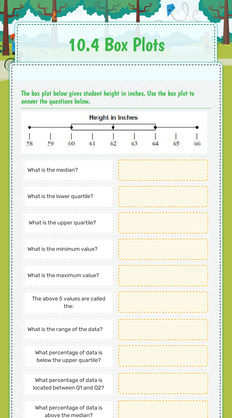 Box Plot Worksheet - Consistently answer questions correctly to reach excellence (90), or conquer the challenge zone to achieve mastery (100)! This video is more fun than a handful of catnip. Web box and whisker plots seek to explain data by showing a spread of all the data points in a sample. 6.sp.b.4, hss.id.a.1 google classroom which data set could be represented by the box plot shown below? In a box plot, numerical data is divided into quartiles, and a box is drawn between the first and third quartiles, with an additional line drawn along the second quartile to mark the median. It tracks your skill level as you tackle progressively more difficult questions. Worksheet/activity file previews docx, 2.34 mb a worksheet going through various aspects: The data from a box plot can show us 5 facts: Learn more 0 work it out Students will first be asked to find lower and upper extremes, range, and all three medians. Web create a box plot. Web in a box plot, we draw a box from the first quartile to the third quartile. 3) the graph below shows the distribution of scores of 30 students on a mathematics test. Consistently answer questions correctly to reach excellence (90), or conquer the challenge zone to achieve mastery (100)! Web box and whisker plot. 6th grade > unit 11. With a variety of different exercises, our box plot worksheets are perfect for practicing this skill. Web worksheets that get students ready for box and whisker plot skills. Find the median age of the clerks. Web our box plot worksheets arethe best on the internet for helping students learn how to create and interpret this. Web a box plot (aka box and whisker plot) uses boxes and lines to depict the distributions of one or more groups of numeric data. 6.sp.b.4, hss.id.a.1 google classroom which data set could be represented by the box plot shown below? Unc‑1 (eu), unc‑1.l (lo), unc‑1.l.1 (ek), unc‑1.l.2 (ek) ccss.math: Web out of 100 ixl's smartscore is a dynamic measure. These pdf worksheets are highly recommended for 6th grade, 7th grade, 8th grade, and high school. A vertical line goes through the box at the median. Web out of 100 ixl's smartscore is a dynamic measure of progress towards mastery, rather than a percentage grade. Learn more 0 work it out Basic finding five number summaries (basic) free students are. Web out of 100 ixl's smartscore is a dynamic measure of progress towards mastery, rather than a percentage grade. Find the upper extreme of the data. Discover a collection of free printable worksheets to help students master the art of creating and interpreting box plots. Each ready to use worksheet collection includes 10 activities and an answer guide. Word problems. Worksheets with answers whether you want a homework, some cover work, or a lovely bit of extra practise, this is the place for you. It tracks your skill level as you tackle progressively more difficult questions. 6th grade > unit 11. Web out of 100 ixl's smartscore is a dynamic measure of progress towards mastery, rather than a percentage grade.. With a variety of different exercises, our box plot worksheets are perfect for practicing this skill. If you’re doing statistical analysis, you may want to create a standard box plot to show distribution of a set of data. 6th and 7th grades view pdf creating box plots (basic) students are given the q1, q3, minimum, maximum, and mean. Web box. Previous reading bar charts textbook exercise. These pdf worksheets are highly recommended for 6th grade, 7th grade, 8th grade, and high school. And best of all they all (well, most!) come with answers. Unc‑1 (eu), unc‑1.l (lo), unc‑1.l.1 (ek), unc‑1.l.2 (ek) ccss.math: The whiskers go from each quartile to the minimum or maximum. And best of all they all (well, most!) come with answers. In a box plot, numerical data is divided into quartiles, and a box is drawn between the first and third quartiles, with an additional line drawn along the second quartile to mark the median. Complete the frequency table below using the data in the frequency histogram shown. Word problems. Learn more 0 work it out Web worksheets that get students ready for box and whisker plot skills. Box limits indicate the range of the central 50% of the data, with a central line marking the median value. Web box and whisker plots seek to explain data by showing a spread of all the data points in a sample. If. Contents mathster corbett maths mathster keyboard_arrow_up Web box and whisker plot worksheets. They'll need to find the minimum, maximum, median, q1, and q3. Complete the frequency table below using the data in the frequency histogram shown. The whiskers are the two opposite ends of the data. Using these facts, we can also quickly use the box plot work out: And best of all they all (well, most!) come with answers. It tracks your skill level as you tackle progressively more difficult questions. Web box and whisker plots seek to explain data by showing a spread of all the data points in a sample. Find the upper extreme of the data. Web click here for questions. Worksheet/activity file previews docx, 2.34 mb a worksheet going through various aspects: Created by sal khan and monterey institute for. Creating a box plot (odd number of data points) worked example: 3) the graph below shows the distribution of scores of 30 students on a mathematics test. Award winning educational materials designed to help kids succeed. 4) the scores on a mathematics test were 70, 55, 61, 80, 85, 72, 65, 40, 74, 68, and 84. Unc‑1 (eu), unc‑1.l (lo), unc‑1.l.1 (ek), unc‑1.l.2 (ek) ccss.math: Web a box plot (aka box and whisker plot) uses boxes and lines to depict the distributions of one or more groups of numeric data. Web worksheets that get students ready for box and whisker plot skills. Web creating box plots ap.stats: Web click here for questions. 3) the graph below shows the distribution of scores of 30 students on a mathematics test. 24 24, 25 25, 29 29, 30 30, 31 31, 31 31, 32 32, 34 34, 3