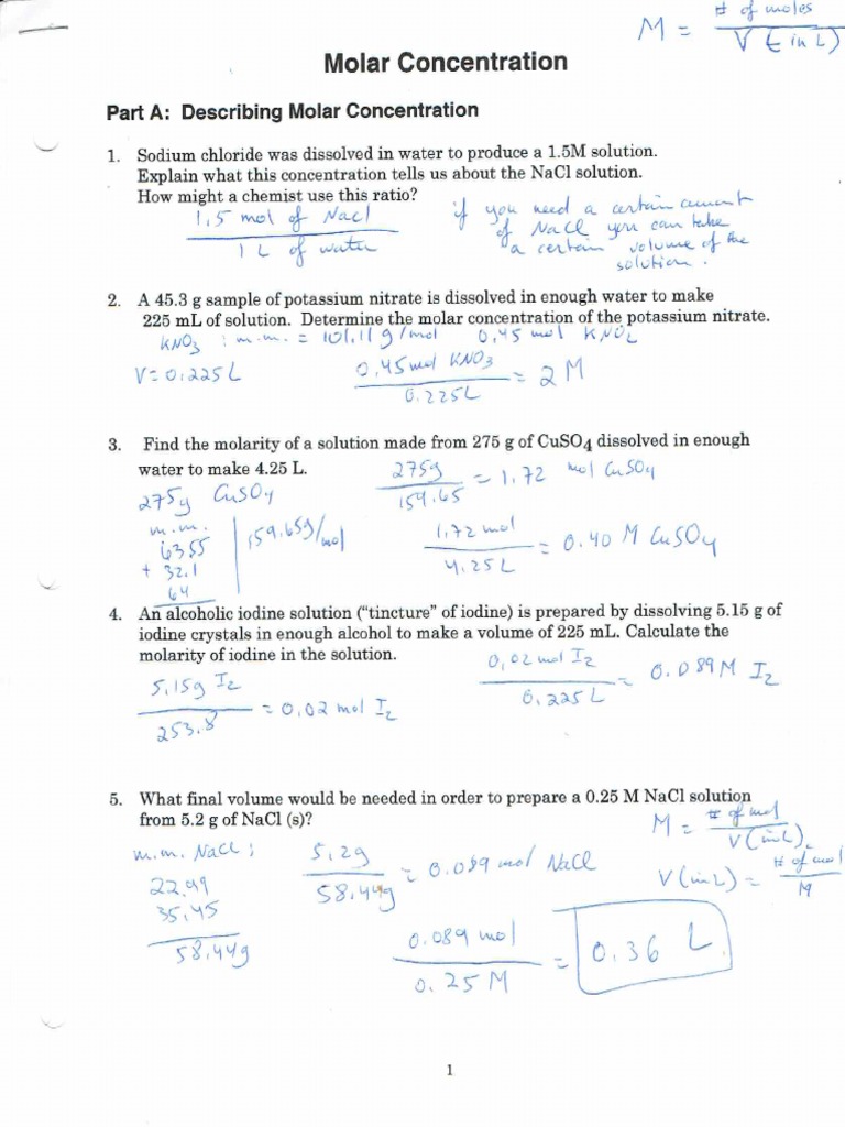 Concentration Worksheet Answer Key - When you do this, the total concentration of. Molarity (m) to get moles of. Part 5, if your instructor requires it) saturation. 3) to use the molarity equation, you need to convert grams of nacl to moles and ml of solution to liters. Volume percent concentration (% by v/v) c. Show all work and circle your final answer. The correct answer to a problem. Web a solution that has many different materials in it. Percent by weight ( % m/m) b. To make a 4.00 m solution, how many moles of solute will be needed if 12.0 liters of solution are required?. Show all work and circle your final answer. Some of the worksheets for this concept are concentration of a solution work, concentration work. Web solution concentration and molarity. Web concentration depending on the particular situation.concentration can be expressed as percent by volume, percent by mass, and molarity.percent volume= volume of solute x. Some of the worksheets for this concept are. Web liters of solution problems: What is a concentrated solution? Volume percent concentration (% by v/v) c. Web total concentration is 0.17 m. Some of the worksheets for this concept are concentration work w 328, concentration work show all work and use the. Volume percent concentration (% by v/v) c. Molarity (m) to get moles of. Web concentration depending on the particular situation.concentration can be expressed as percent by volume, percent by mass, and molarity.percent volume= volume of solute x. What is the percent concentration of each of the following solutions? Web solution concentration and molarity. Web solution concentration and molarity. Web liters of solution problems: Molarity = moles of solute liters of solution 3.00 moles. Molarity (m) to get moles of. The correct answer to a problem. Web solution concentration and molarity. To make a 4.00 m solution, how many moles of solute will be needed if 12.0 liters of solution are required?. Show all work and circle your final answer. Percent by weight ( % m/m) b. What is the molarity of a solution made by dissolving 3.00 moles of nacl in enough water to make. Some of the worksheets for this concept are concentration work w 328, concentration work show all work and use the. This guided worksheet starts by defining molarity and discussing the molarity scale (what's. What is the molarity of a solution made by dissolving 3.00 moles of nacl in enough water to make 6.00 liters of solution? Web total concentration is. Some of the worksheets for this concept are concentration of a solution work, concentration work. Some of the worksheets for this concept are concentration work w 328, concentration work show all work and use the. Web concentration using the simulation “molarity”, try using the simulation “concentration” (you will use this information again in. Molarity = moles of solute liters of. Part 5, if your instructor requires it) saturation. Some of the worksheets for this concept are concentration of a solution work, concentration work. Web a solution that has many different materials in it. Web concentration depending on the particular situation.concentration can be expressed as percent by volume, percent by mass, and molarity.percent volume= volume of solute x. 3) to use. Molarity = moles of solute liters of solution 3.00 moles. What is the % m/m if 8 g copper is added to enough zinc to produce 100 g ofan alloy? What is the percent concentration of each of the following solutions? When you do this, the total concentration of. Show all work and circle your final answer. What is the % m/m if 8 g copper is added to enough zinc to produce 100 g ofan alloy? Web a solution that has many different materials in it. To make a 4.00 m solution, how many moles of solute will be needed if 12.0 liters of solution are required?. Molarity = moles of solute liters of solution 3.00. Some of the worksheets for this concept are concentration work w 328, concentration work show all work and use the. What is the percent concentration of each of the following solutions? Part 5, if your instructor requires it) saturation. 3) to use the molarity equation, you need to convert grams of nacl to moles and ml of solution to liters. Web liters of solution problems: Web solution concentration and molarity. Show all work and circle your final answer. Web concentration depending on the particular situation.concentration can be expressed as percent by volume, percent by mass, and molarity.percent volume= volume of solute x. Molarity (m) to get moles of. Some of the worksheets for this concept are concentration of a solution work, concentration work. What is the % m/m if 8 g copper is added to enough zinc to produce 100 g ofan alloy? When you do this, the total concentration of. Molarity = moles of solute liters of solution 3.00 moles. Web a solution that has many different materials in it. To make a 4.00 m solution, how many moles of solute will be needed if 12.0 liters of solution are required?. A solution that has a low molarity. Percent by weight ( % m/m) b. The correct answer to a problem. What is the molarity of a solution made by dissolving 3.00 moles of nacl in enough water to make 6.00 liters of solution? What is a concentrated solution? Web liters of solution problems: Web solution concentration and molarity. A solution that has a low molarity. Percent by weight ( % m/m) b. Molarity = moles of solute liters of solution 3.00 moles. Web a solution that has many different materials in it. What is the % m/m if 8 g copper is added to enough zinc to produce 100 g ofan alloy? Volume percent concentration (% by v/v) c. Web concentration depending on the particular situation.concentration can be expressed as percent by volume, percent by mass, and molarity.percent volume= volume of solute x. Molarity (m) to get moles of. This guided worksheet starts by defining molarity and discussing the molarity scale (what's. What is a concentrated solution? The correct answer to a problem. To make
