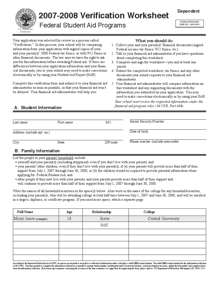 20072008 Verification Worksheet Federal Student Aid Programs Irs