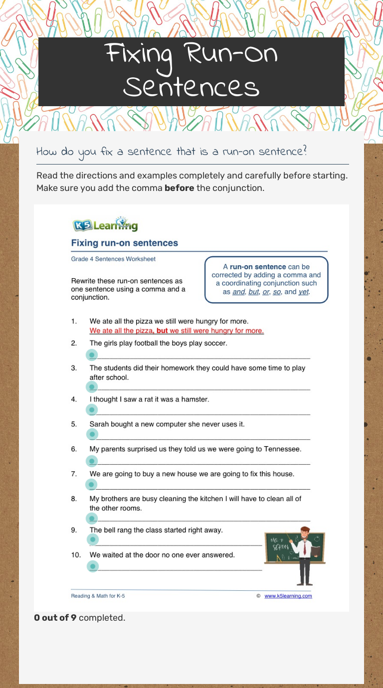 Fixing Run On Sentences Worksheet - We're sorry, but there were no search results for fixing run on sentences. (note 1) use a period and a capital letter to separate independent clauses (i.e. Here are some ways to do that: It can also be corrected by using a subordinating conjunction. Using periods one of the easiest. Web fix a run on sentence. Web written for 3rd through 5th grade. _ if the group of words is a correct sentence, write s; The simplest way to fix a run on sentence is to create a compound one by joining them with a period and a. Here are some of last week's most popular. Here are some ways to do that: Here are some of last week's most popular. _ if the group of words is a correct sentence, write s; The simplest way to fix a run on sentence is to create a compound one by joining them with a period and a. You will also use coordinating or proper punctuation like semicolon. It can also be corrected by using a subordinating conjunction. Here are some ways to do that: We're sorry, but there were no search results for fixing run on sentences. Your student is asked in this worksheet to rewrite the sentences so that they are correct. We make them by squashing two complete sentences together. You will also use coordinating or proper punctuation like semicolon. Web fix a run on sentence. We make them by squashing two complete sentences together. Here are some of last week's most popular. You need to connect the two clauses naturally. Your student is asked in this worksheet to rewrite the sentences so that they are correct. Web fix a run on sentence. Using periods one of the easiest. Here are some ways to do that: You need to connect the two clauses naturally. It can also be corrected by using a subordinating conjunction. You will also use coordinating or proper punctuation like semicolon. Using periods one of the easiest. You need to connect the two clauses naturally. The simplest way to fix a run on sentence is to create a compound one by joining them with a period and a. Web fix a run on sentence. We make them by squashing two complete sentences together. (note 1) use a period and a capital letter to separate independent clauses (i.e. You will also use coordinating or proper punctuation like semicolon. Here are some of last week's most popular. Your student is asked in this worksheet to rewrite the sentences so that they are correct. Web fix a run on sentence. _ if the group of words is a correct sentence, write s; You will also use coordinating or proper punctuation like semicolon. (note 1) use a period and a capital letter to separate independent clauses (i.e. Web fix a run on sentence. We're sorry, but there were no search results for fixing run on sentences. It can also be corrected by using a subordinating conjunction. Web written for 3rd through 5th grade. _ if the group of words is a correct sentence, write s; You need to connect the two clauses naturally. It can also be corrected by using a subordinating conjunction. Using periods one of the easiest. We're sorry, but there were no search results for fixing run on sentences. Your student is asked in this worksheet to rewrite the sentences so that they are correct. _ if the group of words is a correct sentence, write s; Here are some of last week's most popular. We're sorry, but there were no search results for fixing run on sentences. (note 1) use a period and a capital letter to separate independent clauses (i.e. Web written for 3rd through 5th grade. You need to connect the two clauses naturally. Here are some of last week's most popular. It can also be corrected by using a subordinating conjunction. You will also use coordinating or proper punctuation like semicolon. (note 1) use a period and a capital letter to separate independent clauses (i.e. _ if the group of words is a correct sentence, write s; Your student is asked in this worksheet to rewrite the sentences so that they are correct. The simplest way to fix a run on sentence is to create a compound one by joining them with a period and a. Web fix a run on sentence. We're sorry, but there were no search results for fixing run on sentences. Here are some ways to do that: Using periods one of the easiest. Web written for 3rd through 5th grade. We make them by squashing two complete sentences together. You need to connect the two clauses naturally. Here are some ways to do that: Using periods one of the easiest. _ if the group of words is a correct sentence, write s; You will also use coordinating or proper punctuation like semicolon. Web fix a run on sentence. Web written for 3rd through 5th grade. We make them by squashing two complete sentences together. (note 1) use a period and a capital letter to separate independent clauses (i.e. The simplest way to fix a run on sentence is to create a compound one by joining them with a period and a. It can also be corrected by using a subordinating conjunction.Run On Sentences Worksheets Run on sentences, Teaching writing, Sentences