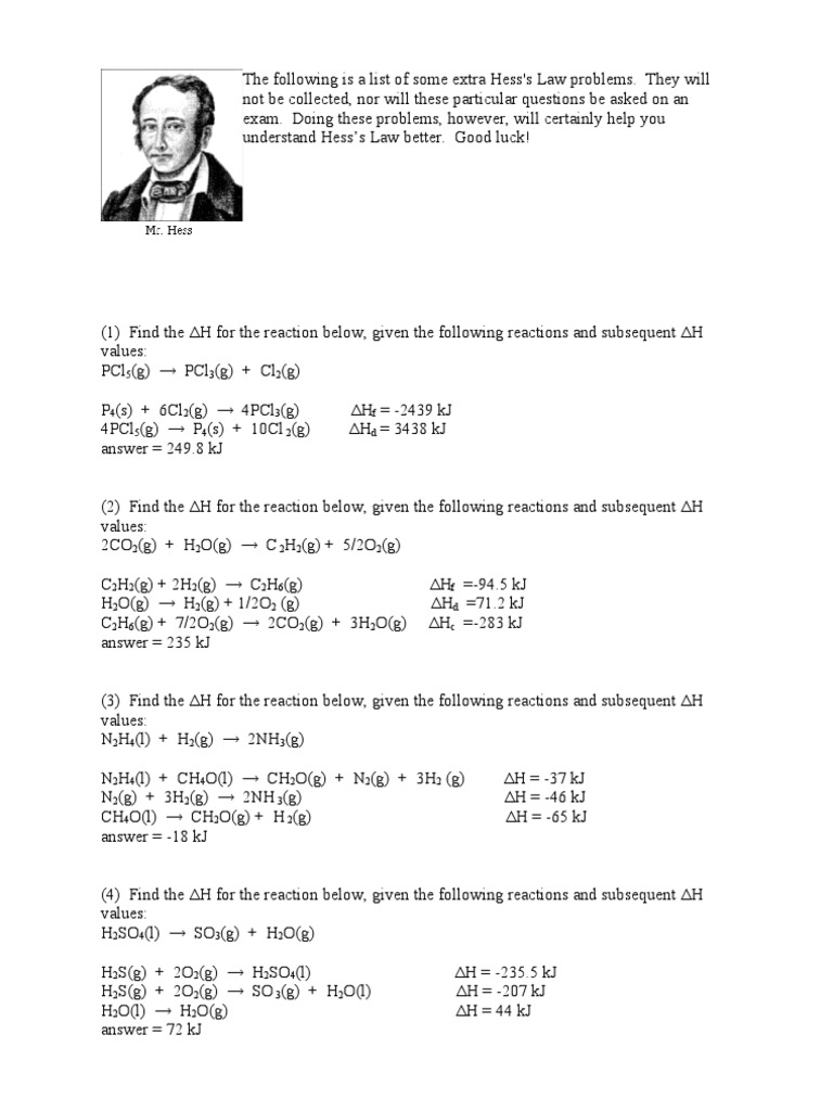 Hesss Law Worksheet - Web learn for free about math, art, computer programming, economics, physics, chemistry, biology, medicine, finance, history, and more. Web hess's law of constant heat summation (or just hess's law) states that regardless of the multiple stages or steps of a reaction, the total enthalpy change for the. The minimum wage in california is currently $15.50/hour for all employers. Web answers to hess’s law worksheet. Printed forms can be ordered online through the. Web hess's law worksheet calculate h for the reaction: Web know the first law of thermodynamics. Web using the hess’s law and the enthalpies of the given reactions, calculate the enthalpy of the following oxidation reaction between cuo and hcl: Web hess's law worksheet calculate h for the reaction: Using the following two equations:. It only changes form and is. They will not be collected, nor will these particular questions be asked on an exam. A 505 g piece of copper tubing is heated to 99.9°c and placed in an insulated vessel containing 59.8 g of water at 24.8°c. The hess law finds its roots in the first law of thermodynamics which states that. _______________________________________ please show work on separate lined paper. Web know the first law of thermodynamics. Using the following two equations:. Web learn for free about math, art, computer programming, economics, physics, chemistry, biology, medicine, finance, history, and more. C 2 h 4 (g) + 3 o 2 (g) → 2 co 2 (g). A 505 g piece of copper tubing is heated to 99.9°c and placed in an insulated vessel containing 59.8 g of water at 24.8°c. Calculate ∆h for the reaction c 2 h 4 (g) + h 2 (g) → c 2 h 6 (g), from the following data. Some cities and counties have higher minimum wages than the state’s rate.. Calculate ∆h for the reaction c 2 h 4 (g) + h 2 (g) → c 2 h 6 (g), from the following data. When you press new problem a window will appear which presents a hess' law scenario. Understand the concepts of heat. Web know the first law of thermodynamics. Assuming no loss of water and a heat capacity. C 2 h 4 (g) + 3 o 2 (g) → 2 co 2 (g). Web hess' law this page is an exercise in using hess' law. Web introduction hess’s law can be stated as ‘the heat evolved or absorbed in a chemical process is the same, whether the process takes place in one or in several steps’. When you. Web hess' law this page is an exercise in using hess' law. Web hess's law worksheet calculate h for the reaction: It only changes form and is. A 505 g piece of copper tubing is heated to 99.9°c and placed in an insulated vessel containing 59.8 g of water at 24.8°c. Khan academy is a nonprofit with the. A 505 g piece of copper tubing is heated to 99.9°c and placed in an insulated vessel containing 59.8 g of water at 24.8°c. It only changes form and is. Printed forms can be ordered online through the. Assuming no loss of water and a heat capacity for. The minimum wage in california is currently $15.50/hour for all employers. Calculate ∆h for the reaction c 2 h 4 (g) + h 2 (g) → c 2 h 6 (g), from the following data. Web hess's law worksheet calculate h for the reaction: It only changes form and is. Khan academy is a nonprofit with the. The hess law finds its roots in the first law of thermodynamics which states. Using the following two equations:. Calculate ∆h for the reaction c 2 h 4 (g) + h 2 (g) → c 2 h 6 (g), from the following data. Assuming no loss of water and a heat capacity for. If the new window covers up. Web learn for free about math, art, computer programming, economics, physics, chemistry, biology, medicine, finance,. Official hud forms used in all programs and other commonly used forms are available online to print and download. The minimum wage in california is currently $15.50/hour for all employers. Web hess' law this page is an exercise in using hess' law. Web using the hess’s law and the enthalpies of the given reactions, calculate the enthalpy of the following. 2cuo(s) + 4hcl(g) → 2cucl(s) + cl. C 2 h 4 (g) + 3 o 2 (g) → 2 co 2 (g). Calculate ∆h for the reaction c 2 h 4 (g) + h 2 (g) → c 2 h 6 (g), from the following data. It only changes form and is. Assuming no loss of water and a heat capacity for. Assuming no loss of water and a. Web hess's law worksheet calculate h for the reaction: Some cities and counties have higher minimum wages than the state’s rate. Web learn for free about math, art, computer programming, economics, physics, chemistry, biology, medicine, finance, history, and more. A 505 g piece of copper tubing is heated to 99.9°c and placed in an insulated vessel containing 59.8 g of water at 24.8°c. Web answers to hess’s law worksheet. Web hess's law of constant heat summation (or just hess's law) states that regardless of the multiple stages or steps of a reaction, the total enthalpy change for the. A 505 g piece of copper tubing is heated to 99.9°c and placed in an insulated vessel containing 59.8 g of water at 24.8°c. Calculate ∆h for the reaction c 2 h 4 (g) + h 2 (g) → c 2 h 6 (g), from the following data. _______________________________________ please show work on separate lined paper. They will not be collected, nor will these particular questions be asked on an exam. Web introduction hess’s law can be stated as ‘the heat evolved or absorbed in a chemical process is the same, whether the process takes place in one or in several steps’. Calculate the enthalpy for the following reaction: Understand the concepts of heat. Official hud forms used in all programs and other commonly used forms are available online to print and download. It only changes form and is. C 2 h 4 (g) + 3 o 2 (g) → 2 co 2 (g). C 2 h 4 (g) + 3 o 2 (g) → 2 co 2 (g) + 2 h 2 o (l). Web hess' law this page is an exercise in using hess' law. Understand the concepts of heat. Calculate ∆h for the reaction c 2 h 4 (g) + h 2 (g) → c 2 h 6 (g), from the following data. Calculate the enthalpy for the following reaction