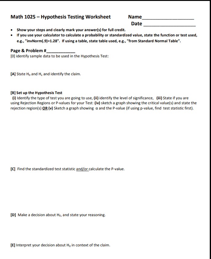 Solved Math 1025 Hypothesis Testing Worksheet Name Date Show