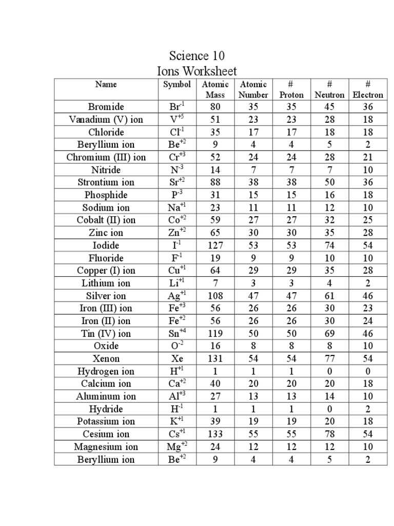 Ions Worksheet Answers - Not all answers to questions are included in the video. For the questions below determine if the particle that is described in an atom or an ion. Two types of bonding concept review exercises answers exercises answers 3.2: Cations lose their outer most energy level , so the atomic radius will decrease b. Chemistry library > unit 1 lesson 3: Be sure to include the charge. Worksheets are name suffixes tion and sion, atoms ions work, ion symbol protons electrons charge, net ionic equation work. Give the formula for each of the following ionic compounds a. (octet rule, valence electrons, electron dot structures, cations,group) electron dot structures. Web and hold up short answers; Web ions worksheet use your periodic table to fill in the missing spaces below. Give the formula for each of the following ionic compounds a. Mettalic elements tend to ______ electrons. How do atoms become cations and anions? Ions concept review exercises answers key takeaways exercises answers 3.3: Chemistry library > unit 1 lesson 3: How do atoms become cations and anions? In the first table, for each of the ions, indicate the total number of protons and electrons. Web polyatomic ions worksheet polyatomic practice 1. Web ions worksheet use your periodic table to fill in the missing spaces below. More complex questions could be discussed in groups. Not all answers to questions are included in the video. Two types of bonding concept review exercises answers exercises answers 3.2: Ions concept review exercises answers key takeaways exercises answers 3.3: Some of the questions will draw on prior. Diagrams that show valence electrons as dots are called_____. Not all answers to questions are included in the video. Give the formula for each of the following ionic compounds a. Finding the formula of an ionic compound predict the charge on monatomic ions naming ionic compounds Web and hold up short answers; Group 1a ions have a ________ charge, whereas group. Be sure to include the charge. Web ions worksheet use your periodic table to fill in the missing spaces below. Not all answers to questions are included in the video. Web and hold up short answers; Web naming ions worksheet answers 1. Chemistry library > unit 1 lesson 3: For the questions below determine if the particle that is described in an atom or an ion. Web ions worksheet use your periodic table to fill in the missing spaces below. Number of electrons lost or gained: Worksheets are name suffixes tion and sion, atoms ions work, ion symbol protons electrons charge, net ionic equation work. Web ions that consist of a single atom are called _______ ions. Give the formula for each of the following ionic compounds a. In the first table, for each of the ions, indicate the total number of protons and electrons. Not. Names and formulas of ionic compounds naming monatomic ions and ionic compounds common polyatomic ions polyatomic ions naming ionic compound with polyvalent ion worked example: Web ions that consist of a single atom are called _______ ions. This makes the attraction between protons & electrons weaker and the electrons can move farther away from the nucleus, causing the radius to. Web ions worksheet use your periodic table to fill in the missing spaces below. Give the formula for each of the following ionic compounds a. Group 1a ions have a ________ charge, whereas group. Use your periodic table to complete the table below. This makes the attraction between protons & electrons weaker and the electrons can move farther away from. Group 1a ions have a ________ charge, whereas group. Anions gain electrons, so they will have more electrons than protons. Two types of bonding concept review exercises answers exercises answers 3.2: Ions concept review exercises answers key takeaways exercises answers 3.3: (octet rule, valence electrons, electron dot structures, cations,group) electron dot structures. In the second table, when given the protons and electrons, indicate the ion with the correct charge. Mettalic elements tend to ______ electrons. Finding the formula of an ionic compound predict the charge on monatomic ions naming ionic compounds Element atomic number protons electrons group # valence electrons cation or anion? Web ions that consist of a single atom are called _______ ions. Some of the questions will draw on prior. Anions gain electrons, so they will have more electrons than protons. Be sure to include the charge. Chemistry library > unit 1 lesson 3: You can use this worksheet to learn how ions are formed, and the different types of ions that are formed in a chemical reaction. Not all answers to questions are included in the video. (octet rule, valence electrons, electron dot structures, cations,group) electron dot structures. This makes the attraction between protons & electrons weaker and the electrons can move farther away from the nucleus, causing the radius to increase. Web this bundle includes four worksheets each with a complete answer key:1 for protons, neutrons, electrons1 for protons, neutrons, electrons, ions1 for protons, neutrons, electrons, isotopes1 for protons, neutrons, electrons, ions, and isotopesneed more resources on isotopes and average atomic mass?how to calculate average atomic mass. Web naming ions worksheet answers 1. More complex questions could be discussed in groups. Formulas for ionic compounds concept review exercises answers key takeaways exercises answers 3.4: Web isotopes & ions worksheet answer the following questions below using your notes or your book. Web ions worksheet use your periodic table to fill in the missing spaces below. In the first table, for each of the ions, indicate the total number of protons and electrons. In the first table, for each of the ions, indicate the total number of protons and electrons. This makes the attraction between protons & electrons weaker and the electrons can move farther away from the nucleus, causing the radius to increase. In the second table, when gi