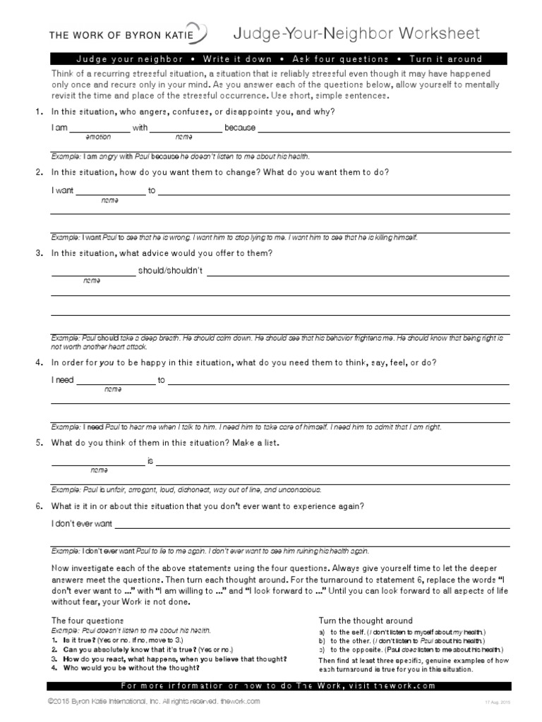 Judge Your Neighbor Worksheet - If yes, we’ve got you covered. Think of a stressful situation with someone—for example, an argument. Web “judge your neighbor” worksheet (compiled by laura m. Web in this video we will talk about judge your neighbor worksheet used in the work of byron katie and hear some practical tips on how to fill it in properly.===. Fill in the blanks below, writing about someone whom you havent yet forgiven one hundred percent. Instructions for doing the work. Web questioning what you believe can be very liberating, moreover, as it frees us from the “mind trap” of our own dogma. Web free collection of judge your neighbor worksheets for students. Web byron katie judge your neighbor worksheet. Judge your n eighbor • write it down • ask four questions • turn it around think of a recurring stressful situation, a situation that is. What a great tool for the resourcefulness bag! Think of a stressful situation with someone—for example, an argument. As you meditate on that specific. You can find all of her tools and videos how to do the tools and. Fill in the blanks below, writing about someone whom you havent yet forgiven one hundred percent. What a great tool for the resourcefulness bag! Web in this video we will talk about judge your neighbor worksheet used in the work of byron katie and hear some practical tips on how to fill it in properly.===. Web “judge your neighbor” worksheet (compiled by laura m. If yes, we’ve got you covered. Instructions for doing the work. Web questioning what you believe can be very liberating, moreover, as it frees us from the “mind trap” of our own dogma. 97k views 12 years ago. Worksheets are judge your neighbor work, judge your neigh. Web byron katie judge your neighbor worksheet. Judge your n eighbor • write it down • ask four questions • turn it around think. Web in this video we will talk about judge your neighbor worksheet used in the work of byron katie and hear some practical tips on how to fill it in properly.===. If yes, we’ve got you covered. Web free collection of judge your neighbor worksheets for students. Instructions for doing the work. Judge your n eighbor • write it down. If yes, we’ve got you covered. Instructions for doing the work. Web questioning what you believe can be very liberating, moreover, as it frees us from the “mind trap” of our own dogma. Think of a stressful situation with someone—for example, an argument. Fill in the blanks below, writing about someone whom you havent yet forgiven one hundred percent. Web “judge your neighbor” worksheet (compiled by laura m. As you meditate on that specific. Worksheets are judge your neighbor work, judge your neigh. If yes, we’ve got you covered. Web byron katie judge your neighbor worksheet. Think of a stressful situation with someone—for example, an argument. Web questioning what you believe can be very liberating, moreover, as it frees us from the “mind trap” of our own dogma. 97k views 12 years ago. Web “judge your neighbor” worksheet (compiled by laura m. What a great tool for the resourcefulness bag! What a great tool for the resourcefulness bag! Judge your n eighbor • write it down • ask four questions • turn it around think of a recurring stressful situation, a situation that is. Web free collection of judge your neighbor worksheets for students. Worksheets are judge your neighbor work, judge your neigh. You can find all of her tools. Web questioning what you believe can be very liberating, moreover, as it frees us from the “mind trap” of our own dogma. 97k views 12 years ago. Web free collection of judge your neighbor worksheets for students. Web byron katie judge your neighbor worksheet. Instructions for doing the work. Instructions for doing the work. Web byron katie judge your neighbor worksheet. Think of a stressful situation with someone—for example, an argument. Judge your n eighbor • write it down • ask four questions • turn it around think of a recurring stressful situation, a situation that is. What a great tool for the resourcefulness bag! Judge your n eighbor • write it down • ask four questions • turn it around think of a recurring stressful situation, a situation that is. Web questioning what you believe can be very liberating, moreover, as it frees us from the “mind trap” of our own dogma. Web “judge your neighbor” worksheet (compiled by laura m. 97k views 12 years ago. Instructions for doing the work. Web byron katie judge your neighbor worksheet. You can find all of her tools and videos how to do the tools and. Fill in the blanks below, writing about someone whom you havent yet forgiven one hundred percent. Web in this video we will talk about judge your neighbor worksheet used in the work of byron katie and hear some practical tips on how to fill it in properly.===. Worksheets are judge your neighbor work, judge your neigh. Think of a stressful situation with someone—for example, an argument. Web free collection of judge your neighbor worksheets for students. What a great tool for the resourcefulness bag! If yes, we’ve got you covered. As you meditate on that specific. Worksheets are judge your neighbor work, judge your neigh. Instructions for doing the work. What a great tool for the resourcefulness bag! Web in this video we will talk about judge your neighbor worksheet used in the work of byron katie and hear some practical tips on how to fill it in properly.===. You can find all of her tools and videos how to do the tools and. Think of a stressful situation with someone—for example, an argument. 97k views 12 years ago. Judge your n eighbor • write it down • ask four questions • turn it around think of a recurring stressful situation, a situation that is. Web free collection of judge your neighbor worksheets for students. Web byron katie judge your neighbor worksheet. Web “judge your neighbor” worksheet (compiled by laura m. If yes, we’