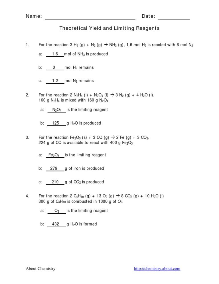 Limiting Reactant And Percent Yield Practice Worksheet Answer Key