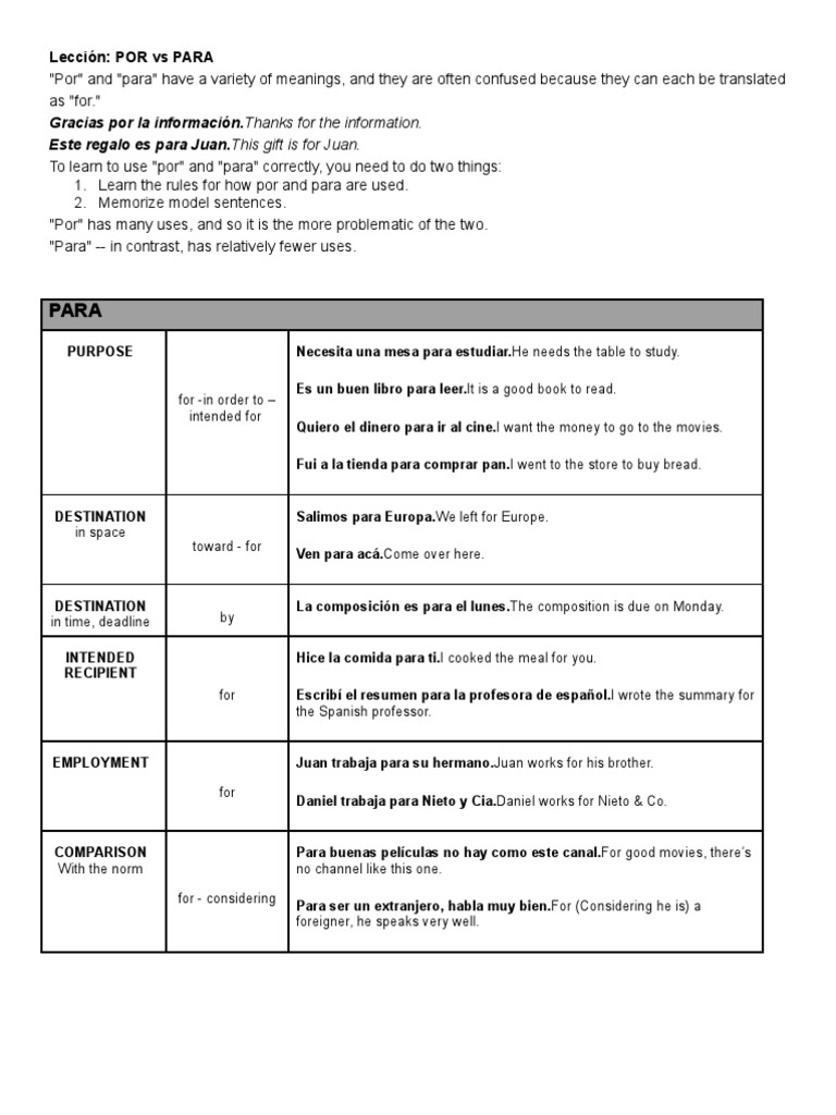 Web This Is A Concise Study Tool For Students Listing All Of The Major Reasons For Using Por And Para With Accompanying Pictures And Example Sentences.