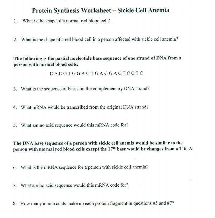 Solved Protein Synthesis Worksheet Sickle Cell Anemia 1.