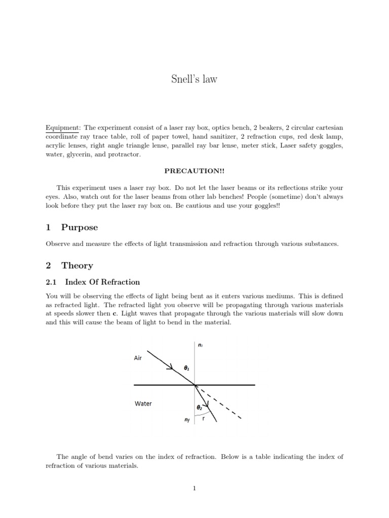 Snell's Law Practice Worksheet - This resource is great for ap physics 2 and high school physics students to practice the fundamen. University of the pacific, mcgeorge school of law and university of the pacific, mcgeorge school of law. Web snell’s law worksheet indexes of refraction air or vacuum: A ray of light traveling through medium \text a a is incident on another medium \text b b, where it refracts making an angle of 60\degree 60° with the normal. N 1 is the index of refraction for the first medium. 45° n1 = 1.5 65° n2 = ? Use this download to help your students practice and apply snell's law with these engaging, organized notes and worksheets! What will the angle of refraction be? To describe the conditions and the cause of refraction and to identify the one exception in which light crosses a boundary without bending. What is the angle of refraction in water? Web view snell’s_law_worksheet (1).pdf from physics 101 at etowah high school. Web practice problem worksheet snell's law index of refraction law questions calculate the speed of light for the following mediums: Individuals who wish to enter a basic recruit training program for law enforcement such as the chp, your county sheriff departments or corrections in the state of california should. Light traveling through air encounters a second medium which slows the light to 2.7 x 108m/s. Web yuba city, ca family law lawyer with 41 years of experience. Web plainfield north high school Which of the following best describes the path of the light as it moves into the lead ? Web refraction and snell's law objectives: What is the angle of refraction in water? Web medical malpractice lawyers serving yuba city, ca (oakland) 1. Here is a collection of 4 worksheets on snell's law and the index of refraction. Teachers are granted permission to use them freely with their students and to use it as part of their curriculum. Light travels from crown glass (n=1.52) into. Angle of incidence / angle of refraction calculations. Here is a collection of 4 worksheets on snell's law and the index of refraction. Light travels from a region of salt into a region of lead, making an angle of incidence of 60 degrees. What will the angle of refraction be? The angle of refraction in air is 60o. Light travels from crown glass (n=1.52) into air (n=1.00). What will the angle of refraction be? Family, divorce, personal injury and real estate. That angles θ 1 and θ 2 are always measured from the normal, never from the interface. Web are your students having a difficult time solving problems using snell's law? Here is a collection of 4 worksheets on snell's law and the index of refraction. 2.45 a ray of light traveling from air into crown glass strikes the surface at an angle of 30 degrees. What is the angle of incidence in glass? Web plainfield north high school Web about this quiz & worksheet. That angles θ 1 and θ 2 are always measured from the normal, never from the interface. Web may 22, 2023 by deep. Light traveling through air encounters a second medium which slows the light to 2.7 x 108m/s. What will the angle of refraction be? To describe the conditions and the cause of refraction and to identify the one. There are 4 worksheets that each sell for $4.80 (1.19 a piece) for $2.70, enough for a full week of work. Law firm website law firm profile. The following set combines all three of the problem types above: This resource is great for ap physics 2 and high school physics students to practice the fundamen. Web snell’s law worksheet indexes. What is the angle of refraction in water? The following quiz and worksheet combo will test your knowledge of snell's law. Use this download to help your students practice and apply snell's law with these engaging, organized notes and worksheets! This resource is great for ap physics 2 and high school physics students to practice the fundamen. Web snell's law. The snell’s law equation, n 1 sin θ 1 = n 2 sin θ 2, precisely describes the correlation between the angle of incidence (θ 1 ), the angle of refraction (θ 2 ), the refractive index of medium 1 (n 1 ), and the refractive index of medium 2 (n 2 ). Web snell’s law worksheet indexes of refraction. To describe the conditions and the cause of refraction and to identify the one exception in which light crosses a boundary without bending. Light travels from crown glass (n=1.52) into water (n=1.33). Here is a collection of 4 worksheets on snell's law and the index of refraction. Which of the following best describes the path of the light as it moves into the lead ? Web plainfield north high school Angle of incidence / angle of refraction calculations. Web yuba city, ca family law lawyer with 41 years of experience. Web about this quiz & worksheet. What is the angle of incidence in glass? The angle incidence in crown glass is 40o. Law firm website law firm profile. The following set combines all three of the problem types above: Name:_ snell’s law practice worksheet 1) for the drawing to the right, find n2. The refractive index of medium \text b b with respect to medium \text a a, n_ {\text {ba}}=\sqrt {\dfrac {2} {3. A ray of light traveling through medium \text a a is incident on another medium \text b b, where it refracts making an angle of 60\degree 60° with the normal. The snell’s law equation, n 1 sin θ 1 = n 2 sin θ 2, precisely describes the correlation between the angle of incidence (θ 1 ), the angle of refraction (θ 2 ), the refractive index of medium 1 (n 1 ), and the refractive index of medium 2 (n 2 ). Web applying snell's law of refraction, $n_i \sin \theta_i=n_r \sin \theta_r$, at the surface that the light enters the glass and solving for unknown refracted angle we get \begin{align*} \sin\theta_r&=\frac {n_i}{n_r}\sin \theta_i \\\\ &=\frac{1.33}{1.5}\sin 30^\circ \\\\ &=0.443\end{align*} and therefore, $\theta_r=26.3^\circ$. Web snell's law and refraction. Web medical malpractice lawyers serving yuba city, ca (oakland) 1. When answ