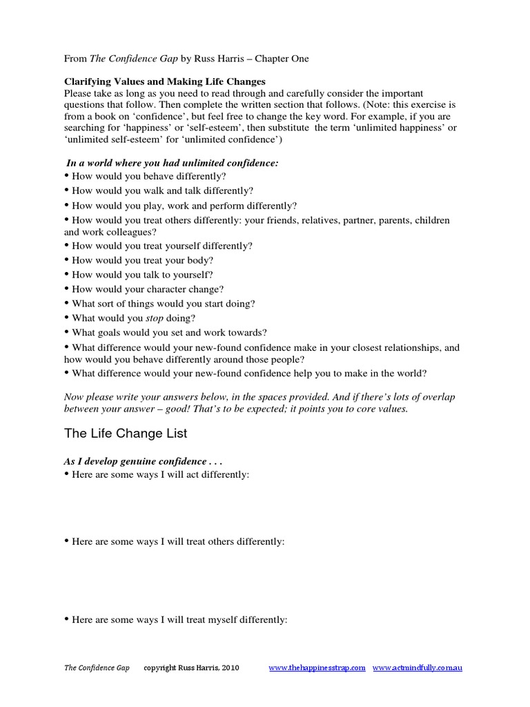 The Confidence Gap Worksheets - Unrealistic appearance ideals and how they can affect confidence in young people; Exley, who teaches at the harvard business school and judd b. Web this one page worksheet provides some tips to help you get the most out the happiness trap book, and offers advice if you get stuck or confused. Please don’t expect that elevating your level of confidence means you’re going to be absolutely sure of yourself at all times. Which are precursors to more serious mental and physical health conditions. Web according to christine l. Web it’s a great confidence builder. • free yourself from common. It refers to a person’s global appraisal of his or her value based upon the scores that persons gives themselves in different roles and domains of life (harter, 1999; Therapy, the confidence gap explains how to: Then complete the written section that follows. It is certainly not because of stupidity, or laziness, or negative thinking, or a deprived childhood, or a chemical imbalance in the brain. Web we would like to show you a description here but the site won’t allow us. Final thoughts on bridging the confidence gap. Many of these worksheets you will want. Misconceptions about what confidence is and how to build it • transform your relationship with. Which are precursors to more serious mental and physical health conditions. The complete set of client handouts and worksheets from act made simple. Please take as long as you need to read through and carefully consider the important questions that follow. Chapter one of the. Please take as long as you need to read through and carefully consider the important questions that follow. Web it’s a great confidence builder. Unrealistic appearance ideals and how they can affect confidence in young people; We hope you find them helpful. Therapy, the confidence gap explains how to: Take me to the program. Then complete the written section that follows. Therapy, the confidence gap explains how to: Final thoughts on bridging the confidence gap. Clarifying values and making life changes. It is certainly not because of stupidity, or laziness, or negative thinking, or a deprived childhood, or a chemical imbalance in the brain. Please take as long as you need to read through and carefully consider the important questions that follow. Chapter one of act with love, 2ndedition. Web we would like to show you a description here but the. Chapter one of act with love, 2ndedition. Web we would like to show you a description here but the site won’t allow us. How does fear feel physically? Web download the confidence gap worksheets (pdf file) if you have any questions, please get in touch, we are here to help. It refers to a person’s global appraisal of his or. Introduction and first chapter of the confidence gap. It refers to a person’s global appraisal of his or her value based upon the scores that persons gives themselves in different roles and domains of life (harter, 1999; Clarifying values and making life changes. Please take as long as you need to read through and carefully consider the important questions that. Web of confidence is not due to any fault of their own. Web we would like to show you a description here but the site won’t allow us. Misconceptions about what confidence is and how to build it • transform your relationship with. It refers to a person’s global appraisal of his or her value based upon the scores that. This exercise is from a book on ‘confidence’, but feel free to change the key word. This is the same as the process of recognizing and labeling your negative thoughts, except now, you’ll also pay attention to your body. Then complete the written section that follows. It refers to a person’s global appraisal of his or her value based upon. Web of confidence is not due to any fault of their own. Web the confidence gap : It refers to a person’s global appraisal of his or her value based upon the scores that persons gives themselves in different roles and domains of life (harter, 1999; Recognize and label the feeling and thoughts of fear in your mind. Then complete. Please take as long as you need to read through and carefully consider the important questions that follow. Then complete the written section that follows. Final thoughts on bridging the confidence gap. Web the complete worksheets for the confidence gap. Web the worksheets in this compilation are designed to be used in conjunction with the confidence gap. Web this one page worksheet provides some tips to help you get the most out the happiness trap book, and offers advice if you get stuck or confused. Web it’s a great confidence builder. Web we would like to show you a description here but the site won’t allow us. It refers to a person’s global appraisal of his or her value based upon the scores that persons gives themselves in different roles and domains of life (harter, 1999; The complete worksheets for act with love. Introduction and first chapter of the confidence gap. Web the confidence gap : It is simply because they do not know the rules of the confidence game. This is the same as the process of recognizing and labeling your negative thoughts, except now, you’ll also pay attention to your body. • free yourself from common. • free yourself from common misconceptions about what confidence is and how to build it • transform your relationship with fear and anxiety • clarify your core values and use them. Complete worksheets for the confidence gap The complete set of client handouts and worksheets from act made simple. This exercise is from a book on ‘confidence’, but feel free to change the key word. Web of confidence is not due to any fault of their own. Recognize and label the feeling and thoughts of fear in your mind. This exercise is from a book on ‘confidence’, but feel free to change the key word. Complete worksheets for the confidence gap Web the worksheets in this compilation are designed to be 