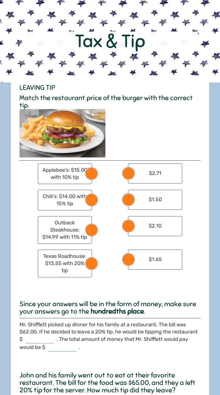 Tip And Tax Worksheet - To calculate sales tax, find the tax rate of the price. Your students can use the percent key on their calculators or can review how to turn a. 9) original price of a book: Since 1984, social security beneficiaries with total income exceeding certain thresholds have been required to pay federal income tax on some of their benefit income. 7) a store has a sale for 20 % off. Web jul 27, 2023 11:00 am edt. With a \(20\%\) discount, ella was able to save \($40\) on a dress. What is the amount of tax on his purchase if he must pay a 6% sales tax? To find tip, multiply the rate to the selling price. Web reinforce how to calculate the percent of increase or decrease, discounts, markups, tips, and sales tax with these 24 task cards. To find tax, multiply the tax rate to the taxable amount (income, property value, etc.) tip: A tax put on a good that goes to the government to pay for programs. Web a) how much money do you need to pay the server? Your students can use the percent key on their calculators or can review how to turn a.. What is the amount of tax on his purchase if he must pay a 6% sales tax? Also see the instructions for lines 1 and 2. A tax put on a good that goes to the government to pay for programs. 24% salestax:7.3%tip:18% 5) foodbillbeforetax:$62 6)foodbillbeforetax:$. Answer key provided.great for basic independent practice or as a station activity. What is the amount of tax on his purchase if he must pay a 6% sales tax? 10) original price of a cellphone: 9) original price of a book: The worksheet contains 12 problems. The guided notes includes vocabulary and one example of each type of percents application (sales tax, tips, and commission). Ally got a haircut for $45. You can complete the optional worksheet for determining if you must file form 8027 for calendar year 2022, later, to determine if you must file form 8027. Your students can use the percent key on their calculators or can review how to turn a percent into a decimal to multiply. A tax put on. This worksheet is an excellent review of operations with percentages with a seasonal flair. Web the worksheet contains 12 problems. Percents are used to calculate sales tax. Full service for personal taxes full service for business taxes. With a \(20\%\) discount, ella was able to save \($40\) on a dress. A tax put on a good that goes to the government to pay for programs. Percents are used to calculate sales tax. Then, add the sales tax to the original price. Also see the instructions for lines 1 and 2. Web reinforce how to calculate the percent of increase or decrease, discounts, markups, tips, and sales tax with these 24. What is the amount of tax on his purchase if he must pay a 6% sales tax? Web reinforce how to calculate the percent of increase or decrease, discounts, markups, tips, and sales tax with these 24 task cards. Ally got a haircut for $45. Percents are used to calculate sales tax. 8) a store has a sale for 10. Micaela must pay a 10% tax on her new car. This worksheet is an excellent review of operations with percentages with a seasonal flair. The guided notes includes vocabulary and one example of each type of percents application (sales tax, tips, and commission). Web jul 27, 2023 11:00 am edt. 9) original price of a book: Middle school math skills practice bundle color by number activities. Percents are used to calculate sales tax. A tax put on a good that goes to the government to pay for programs. Foodbillbeforetax:$30 2)foodbillbeforetax:$80salestax:6.4%tip:15% salestax:7.9%tip:20% 3) foodbillbeforetax:$45 4)foodbillbeforetax :$24salestax:6.8%tip: Your students can use the percent key on their calculators or can review how to turn a. You can complete the optional worksheet for determining if you must file form 8027 for calendar year 2022, later, to determine if you must file form 8027. Web math on the move. Your students can use the percent key on their calculators or can review how to turn a percent into a decimal to multiply. There's nothing too taxing about. A) how much money will you save? The worksheet contains 12 problems. The guided notes includes vocabulary and one example of each type of percents application (sales tax, tips, and commission). Worksheets are a tip wor 15, math tip work, tip and tax homework work, tip skills, tip skills changing your body chemistry, discount tax and tip, name period date tax tip and discount word problems, a mini dbt workbook. Micaela must pay a 10% tax on her new car. Percents are used to calculate sales tax. Web a) how much money do you need to pay the server? To find tip, multiply the rate to the selling price. With a \(20\%\) discount, ella was able to save \($40\) on a dress. This percent coloring worksheet gives students an engaging and self checking way to practice multiple step percent problems. Do your own personal taxes do personal taxes with expert help do business taxes with expert help do taxes with a cd/download. There's nothing too taxing about our printable sales tax worksheets! This worksheet is an excellent review of operations with percentages with a seasonal flair. If her car is $19,000, what is the total price of her purchase? Worksheets are discount tax and tip, tip and tax homework work, taxes tips and sales, sales tax and discount work, tax and tip percent word problems, name date practice tax tip and commission, sales tax and discount work, name period date tax tip and discount word problems. You can complete the optional worksheet for determining if you must file form 8027 for calendar year 2022, later, to determine if you must file form 8027. A tax put on a good that goes to the government to pay for programs. Full service for personal taxes full service for business taxes. Also see the instructions for lines 1 and 2. Pablo is purchasing a sweatshirt for $32.00. Answer key provided.great for basic independent practice or as a station activity. Web generally, you must report the tips allocated to you by your employer