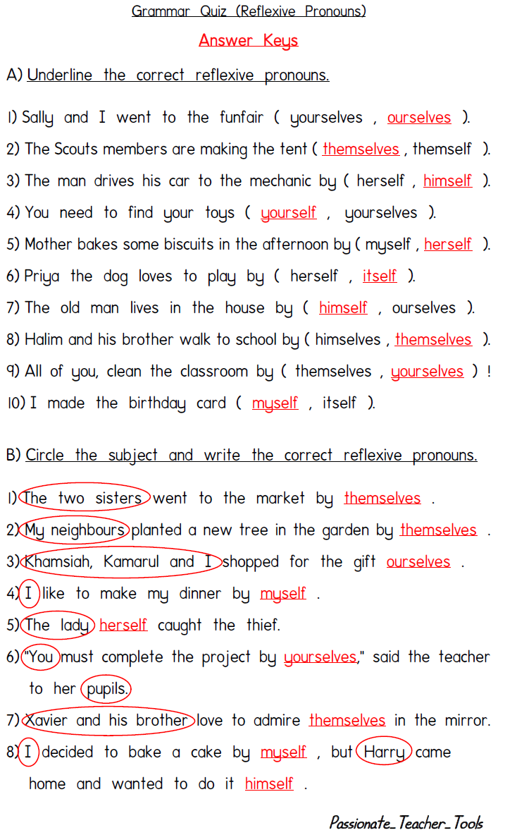 Passionate Teacher Tools Reflexive Pronouns Quiz 1 (With Answers)